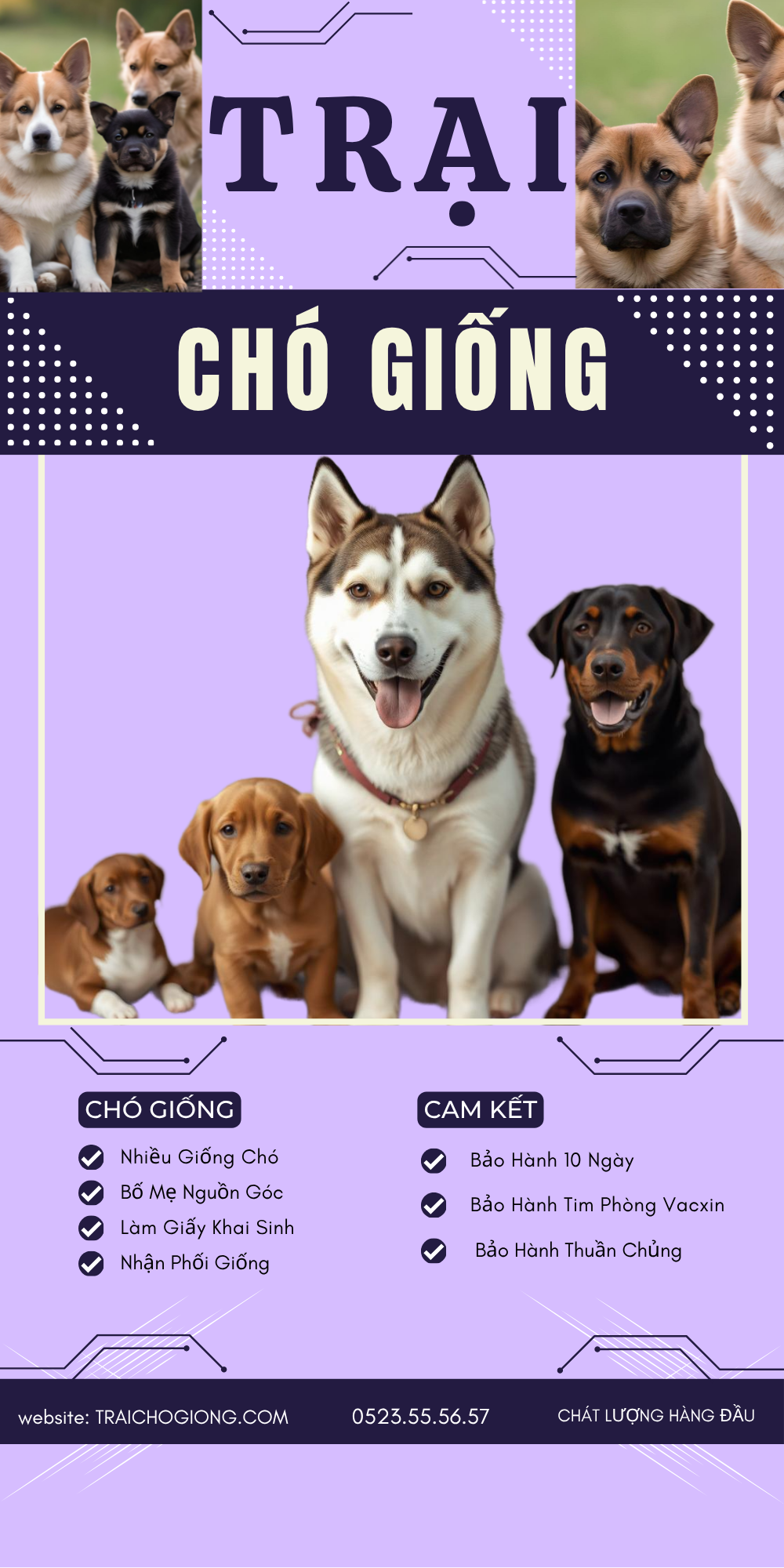 TRẠI CHÓ GIỐNG hiện đang là một trong số những địa chỉ bán chó cảnh uy tín nhất tại TPHCM hiện nay. Trại chuyên mua bán và trao đổi giống chó rottweiler, chó Malinois , chó Becgie, Chó Phú Quốc, chó Corgi, chó Pug, chó Chihuahua, chó Phốc sóc, chó Pull Pháp, chó Dorberman, chó Poodle, chó Samoyed, chó Phốc hươu, chó Lạp xưởng, chó Golden, chó Shiba, chó Husky, chó Alaska... thuần chủng với đầy đủ kích thước và các màu sắc khác nhau để các bạn có thể lựa chọn. Đến với Trại Chó Giống các bạn có thể yên tâm, bởi tất cả các chú chó ở đây đều hoàn toàn khỏe mạnh, được chăm sóc một cách kỹ lưỡng và tiêm phòng đầy đủ.